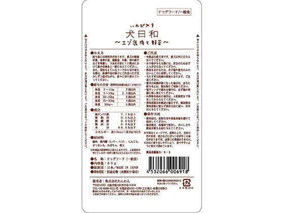 【検索用キーワード】わんわん ワンワン WANWAN 犬日和レトルトエゾ鹿肉と野菜60g 犬日和レトルト エゾ鹿肉と野菜 犬日和 いぬびより イヌビヨリ レトルト 蝦夷鹿 えぞしか エゾシカ やさい 一般食 ウェットフード ペットフード ドッグフード ドックフード エサ 餌 えさ パウチタイプ 1個 60g 60グラム 北海道 鹿肉 ペット 犬 ドッグ ウェットフード犬