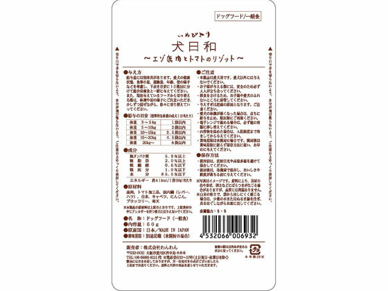 【検索用キーワード】わんわん ワンワン WANWAN 犬日和レトルトエゾ鹿肉とトマトのリゾット60g 犬日和 レトルト エゾ鹿肉とトマトのリゾット いぬびより 蝦夷鹿 全成長段階 高齢犬 老齢犬 一般食 ウェットフード ペットフード ドッグフード ドックフード エサ 餌 えさ パウチタイプ 1個 60g 60グラム 幼犬 シニア犬 ペット 犬 ドッグ ウェットフード犬【全成長段階】60g
